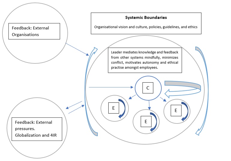 The above figure depicts the autonomous system and subsystems comprised of organisational structure and culture through C (Cultural intelligence) and E (Emotional intelligence). The overall system moves and is mirrored through the internal sub-system dynamics. Leaders primarily reflect organisational culture, and steer employees through input that, in turn, promotes self-motivation to exhibit appropriate behavioural output. As such, employees need to be motivated to act according to their respective sub-systemic boundaries of knowledge and resources of available skillsets. Leaders are the primary input for employees to be equipped with both skillsets and knowledge for adapting to future disruptions.